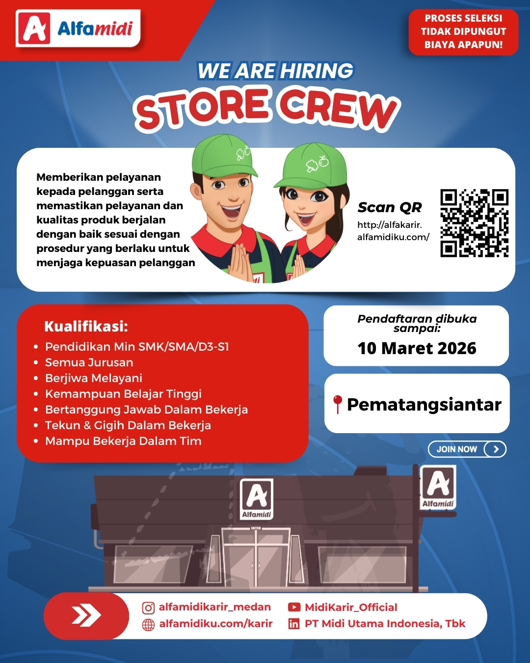 Alfamidi sedang membuka lowongan kerja dengan penempatan di Store Crew nii. Yuk, daftar sekarang melalui link website atau scan barcode yang ada pada postingan yaa.
